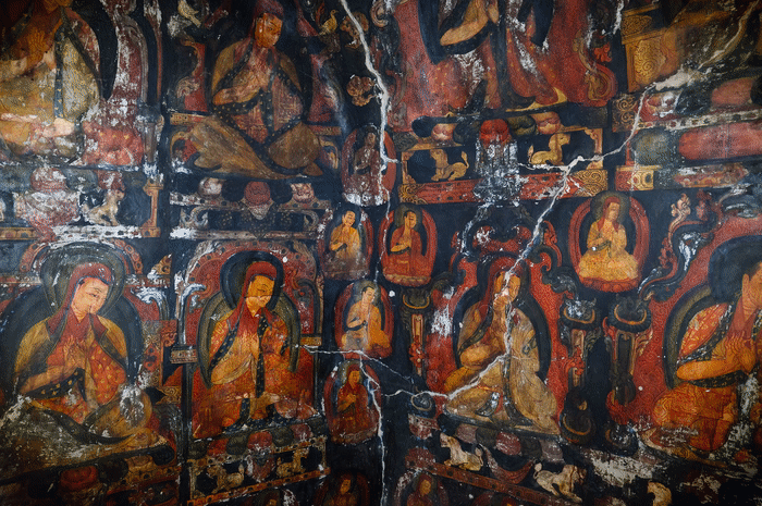 “你們看,這些壁畫顏色多鮮亮,千年不褪色!因?yàn)橛玫娜堑V石做的顏料?!睋?jù)仁增旺扎介紹,皮央石窟分布于前山與后山,石窟數(shù)量接近千座,其中5座內(nèi)繪有壁畫。有研究表明,這里出土的鎧甲片、戰(zhàn)刀等文物,與古格遺址中的同類器物高度相似,皮央石窟在千年前或曾是古格王國的一處重要方城。