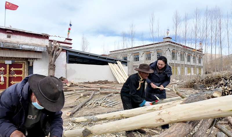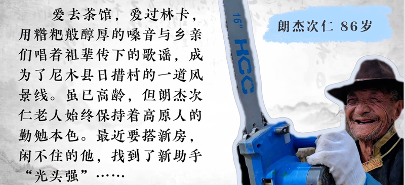 雖已86歲高齡,但朗杰次仁老人始終保持著高原人的勤勉本色。最近老人要搭建新房,我們來時(shí),他正和新助手“光頭強(qiáng)”(電鋸)一起在小院里忙活。