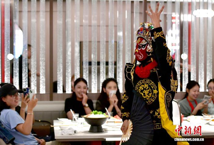 8月4日,西藏拉薩一餐飲店,服務(wù)人員現(xiàn)場表演。近年來,隨著一批涵蓋了零售、餐飲、休閑娛樂等各大領(lǐng)域的品牌首店在拉薩開業(yè),為當(dāng)?shù)孛癖妿碇T多新鮮體驗(yàn)的同時,也促進(jìn)了城市消費(fèi)升級。圖為變臉表演。中新社記者 李林 攝