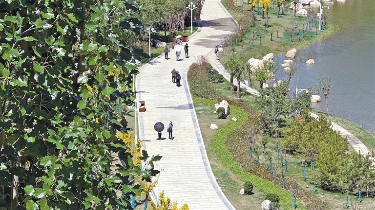 如今,湖水如碧綢般清澈,岸邊綠樹成蔭,各類花卉競(jìng)相綻放。昔日雜亂之地已蛻變?yōu)榫用裥蓍e納涼的好去處。人文古跡與自然景致相映成趣,共同繪就出“百澤繞城·水城相依”的生態(tài)文明畫卷。