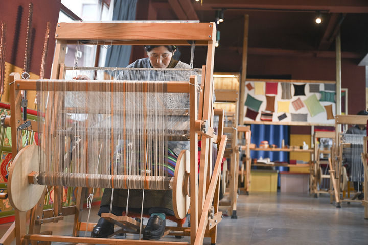 6月28日,在江孜縣班覺倫布村“阿佳格桑工坊”,藏族“阿佳”在編織氆氌。
