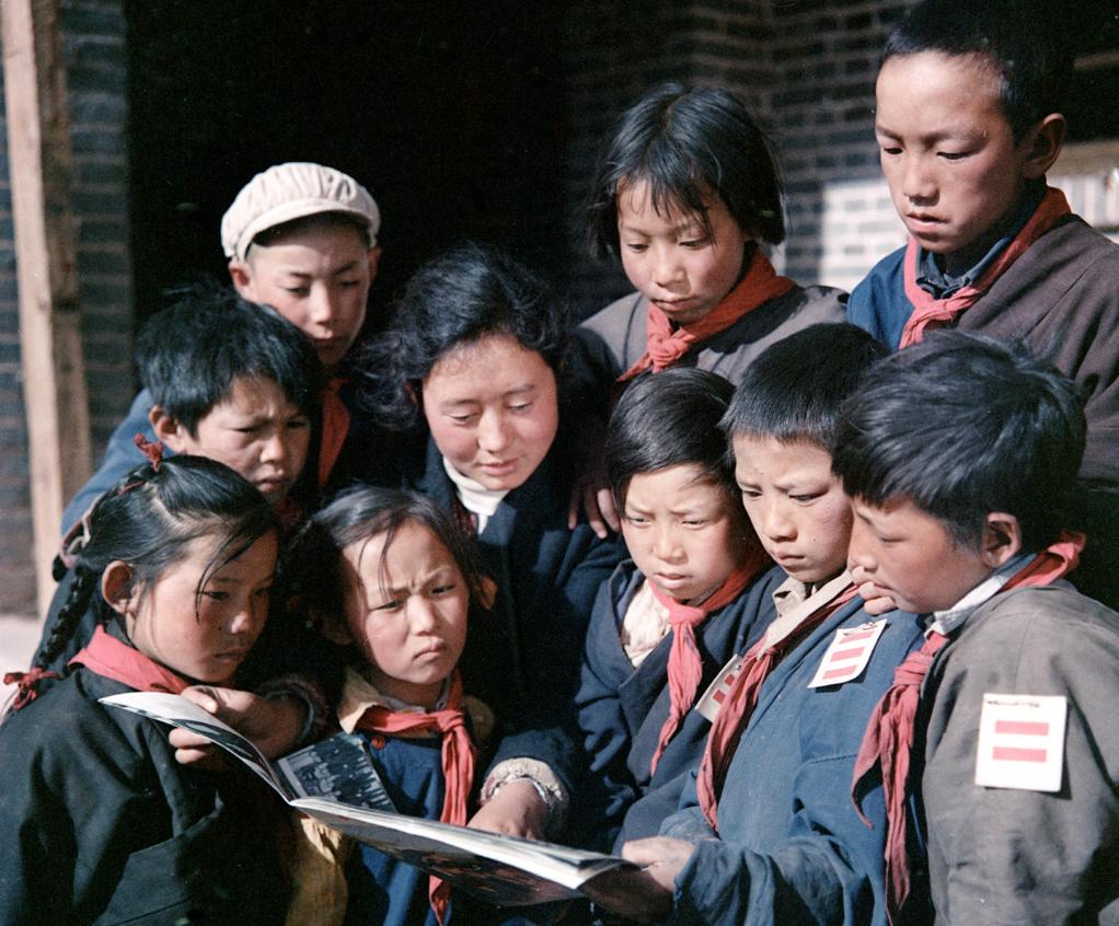 1965年9月,西藏昌都實驗小學(xué)的老師和學(xué)生在看畫報。新華社記者 馬競秋 攝
