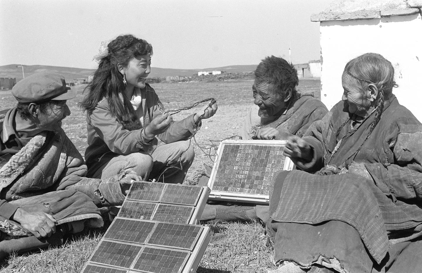1986年3月,那曲地區(qū)(現(xiàn)為那曲市)科委工作人員齊美才央(左二)給牧民講解太陽能電池使用方法。新華社記者 才龍 攝