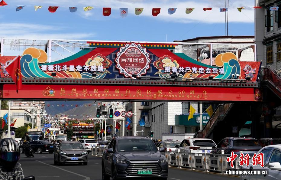 8月19日,隨著西藏自治區(qū)成立60周年慶?;顒?dòng)臨近,拉薩氛圍濃。拉薩街頭,處處是張燈結(jié)彩的盛景,洋溢著一派祥和與歡騰的氛圍。圖為拉薩裝扮一新的人行天橋。中新社記者 李林 攝