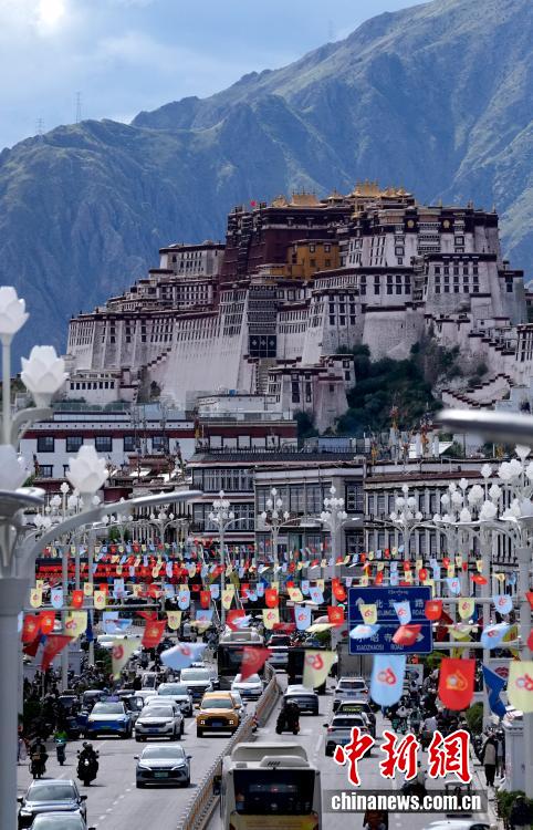8月19日,隨著西藏自治區(qū)成立60周年慶祝活動(dòng)臨近,拉薩氛圍濃。拉薩街頭,處處是張燈結(jié)彩的盛景,洋溢著一派祥和與歡騰的氛圍。圖為拉薩裝扮一新的街頭。中新社記者 李林 攝