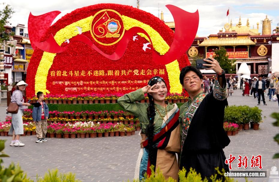 8月19日,隨著西藏自治區(qū)成立60周年慶祝活動(dòng)臨近,拉薩氛圍濃。拉薩街頭,處處是張燈結(jié)彩的盛景,洋溢著一派祥和與歡騰的氛圍。圖為游客在拉薩大昭寺廣場上的大慶宣傳標(biāo)語前留念。中新社記者 李林 攝