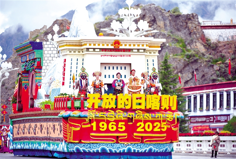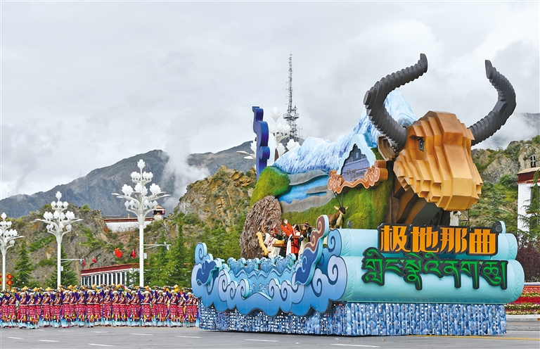 居于方陣中間的七市(地)彩車,各具神韻:拉薩彩車,布達(dá)拉宮“之”字形階梯與綠意南北山相映成趣,黑頸鶴展翅,八廓街古今交融,古城活力撲面而來;日喀則彩車以吉隆口岸為車頭,國門前,兩名著定日服飾的地震災(zāi)區(qū)群眾代表,手捧切瑪,表達(dá)對黨中央的深深感恩之情;山南彩車化牛皮筏為“前進中的方舟”,雅江奔流,激蕩千年歷史與今朝活力;林芝彩車讓雅江托起嘎拉村大門,村黨支部書記捧讀總書記回信,感恩與愛戴隨江風(fēng)遠(yuǎn)揚;昌都彩車以紅旗勾勒車體,“西藏第一面五星紅旗升起的地方”紅色印記熠熠生輝;那曲彩車破浪疾行,天下第一道班、青藏鐵路、公路縮影依次呈現(xiàn),盡顯“極地那曲”改革創(chuàng)新的萬丈豪情;阿里彩車如一葉方舟,岡仁波齊與札達(dá)土林巍然矗立,獅泉河浪花托起“亞洲水塔”的生態(tài)使命。