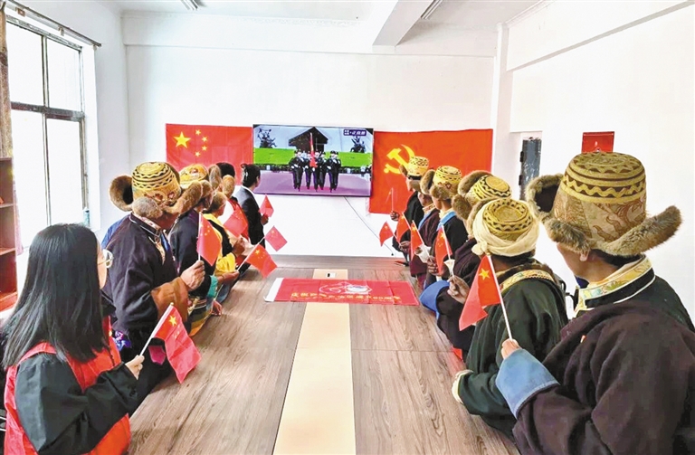 在阿里地區(qū)噶爾縣扎西崗鄉(xiāng)典角村,57歲的次仁久美和家人一同觀看慶祝大會(huì)盛況,熱烈的氛圍感染著屋里的每一個(gè)人?!耙郧拔覀冏〉氖鞘^泥土壘的房子,漏風(fēng)又漏雨,后來換成了土木房,可還是抵不住冬天的寒風(fēng)?,F(xiàn)如今,鋼筋混凝土的房子亮堂又暖和?!贝稳示妹勒f,“好日子是黨給的!作為一名黨員,我要帶著大家一起,不僅把日子過得紅火,更要守好祖國(guó)的每一寸土地?!?/p>