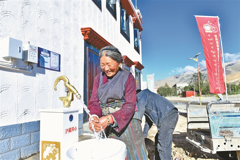 8月7日,拉姆一家分到一棟110平方米的新房。當她擰開锃亮的水龍頭,熱水涌出的瞬間,淚水奪眶而出:“以前兒子沒法在家里洗澡,現在能了,特別開心?!边@簡單的心聲,道出森嘎村600多名村民共同的喜悅。