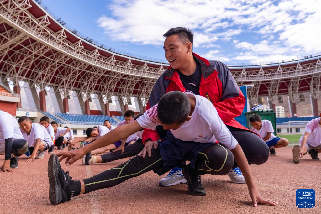 資料圖片:2019年6月22日,摔跤奧運(yùn)冠軍張小平和競走奧運(yùn)冠軍王麗萍在西藏自治區(qū)拉薩市文化體育中心為拉薩市業(yè)余體校的小運(yùn)動(dòng)員們上了一節(jié)訓(xùn)練課。圖為拳擊奧運(yùn)冠軍張小平正在指導(dǎo)小運(yùn)動(dòng)員的壓腿動(dòng)作。新華社記者 孫非 攝