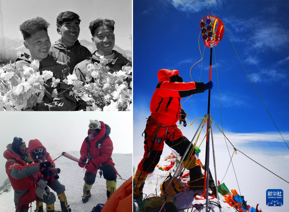 拼版照片:左上圖為1960年5月登上珠穆朗瑪峰頂?shù)闹袊巧疥?duì)隊(duì)員王富洲(右)、貢布(中)和屈銀華(資料照片 新華社發(fā));左下圖為2008年5月8日,北京奧運(yùn)圣火珠峰傳遞登山隊(duì)隊(duì)員羅布占堆(左)點(diǎn)燃第一棒火炬手吉吉手中的“祥云”火炬(新華社發(fā));右圖為2020珠峰高程測量登山隊(duì)隊(duì)員在珠穆朗瑪峰峰頂開展測量工作(2020年5月27日新華社特約記者扎西次仁攝)。新華社發(fā)