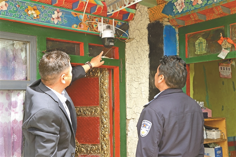 多卻鄉(xiāng)負責人與浪卡子縣公安局民警入戶了解家裝自衛(wèi)探頭運行情況。