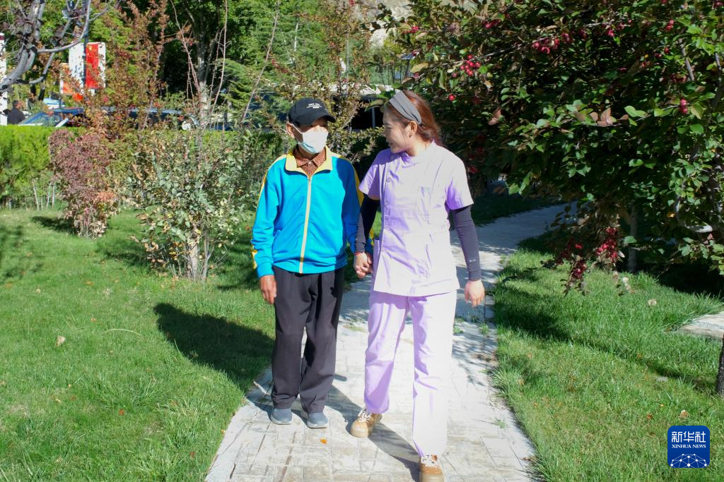 在西藏自治區(qū)殘疾人托養(yǎng)服務中心,護理主管德吉(右一)帶著拉瑪散步(9月23日攝)。新華社記者周昱龍 攝
