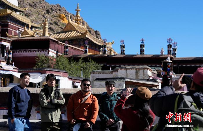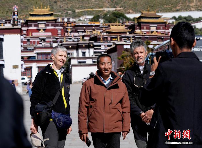 10月7日,外國游客在西藏日喀則市扎什倫布寺與導游合影留念。扎什倫布寺始建于公元1447年,是中國國家5A級旅游景區(qū)。憑借深厚的歷史底蘊和獨特的文化魅力,吸引眾多中外游客參觀游覽。中新社記者 李林 攝