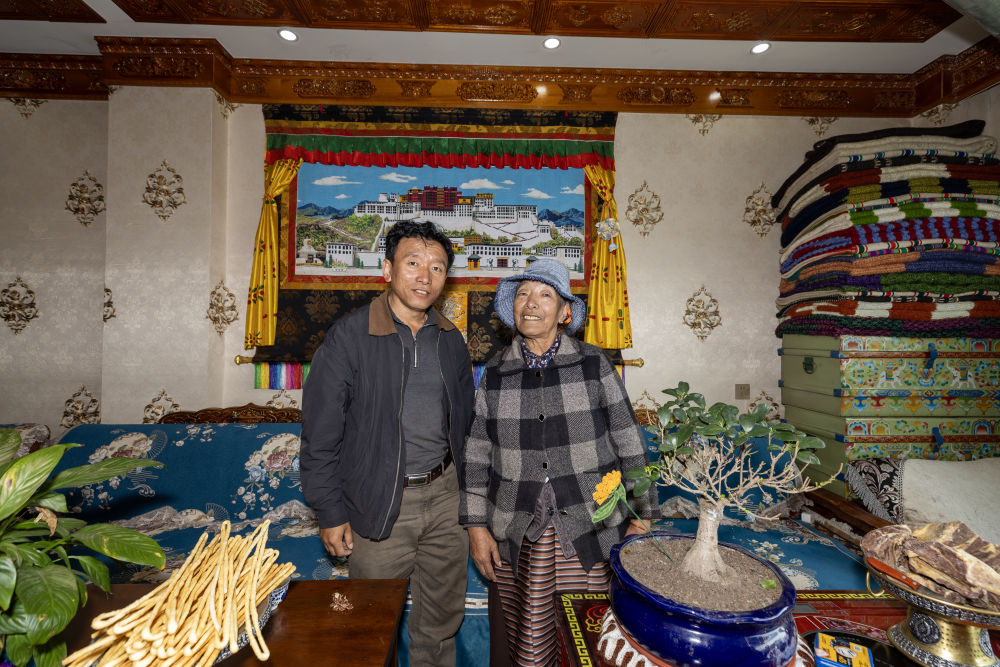 仁青曲珍(右)與兒子在自家客廳合影(9月16日攝)。新華社記者 姜帆 攝