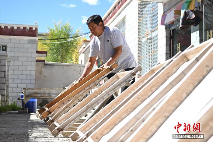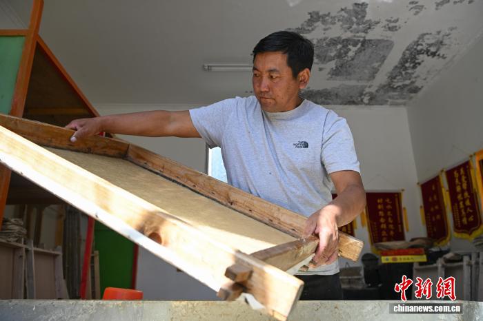 圖為尼木雪拉藏紙農(nóng)牧民專業(yè)合作社負責人格桑旦增在檢查藏紙的質(zhì)量。中新社記者 貢嘎來松 攝