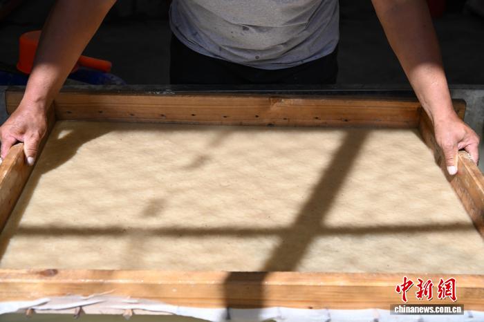 10月16日,“共建中華民族共同體書寫美麗西藏新篇章——魅力新拉薩 幸福高原城”暨中央媒體和網(wǎng)絡名人采風活動走進西藏自治區(qū)拉薩市尼木縣尼木雪拉藏紙農(nóng)牧民專業(yè)合作社采訪中國國家級非物質(zhì)文化遺產(chǎn)代表性項目藏族造紙技藝。據(jù)悉,藏紙傳承至今已有1300多年歷史,雪拉藏紙作為西藏三大藏紙之一,其特殊原料配方造就“蟲不蛀、鼠不咬、不腐不變色”的特性,用它印制的文史經(jīng)典千余年完好如初。圖為尼木雪拉藏紙農(nóng)牧民專業(yè)合作社員工在制作藏紙。中新社記者 貢嘎來松 攝