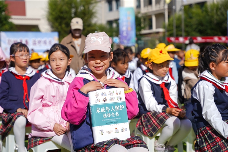 西藏自治區(qū)2025年“送法進(jìn)校園”系列普法宣傳示范活動(dòng)中,孩子們領(lǐng)到《未成年人保護(hù)法律全書》。記者 貢曲羅杰 攝