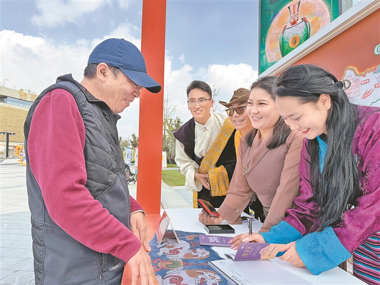 “萬人墨竹探親游”活動的探親證發(fā)放處人潮擁擠,排隊申請領(lǐng)證的市民絡(luò)繹不絕。“我們準(zhǔn)備了1萬本免費發(fā)放的探親證,探親證上詳細(xì)介紹了紅色文化游、藍(lán)色康養(yǎng)游、綠色生態(tài)游、文化探秘游、墨竹深度游精品線路的詳細(xì)內(nèi)容供大家選擇。屆時,我們將準(zhǔn)備好香甜的青稞酒、潔白的哈達(dá)、美味的藏餐等候咱們南京的兄弟姐妹回雪域高原的墨竹家中看看、坐坐?!蹦窆たh文化旅游公司負(fù)責(zé)人扎西措姆在探親證發(fā)放現(xiàn)場介紹道。