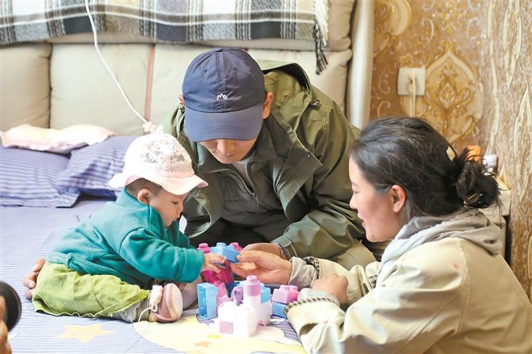 哲古鎮(zhèn)哲古社區(qū)居民白瑪頓珠和妻子在溫暖的臥室里陪兒子做游戲。措美縣委宣傳部供圖