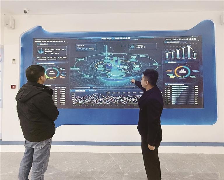西藏網(wǎng)智天元科技集團(tuán)股份有限公司工作人員正在介紹企業(yè)實(shí)時(shí)數(shù)據(jù)分析。 圖由拉薩市稅務(wù)局柳梧新區(qū)稅務(wù)分局提供
