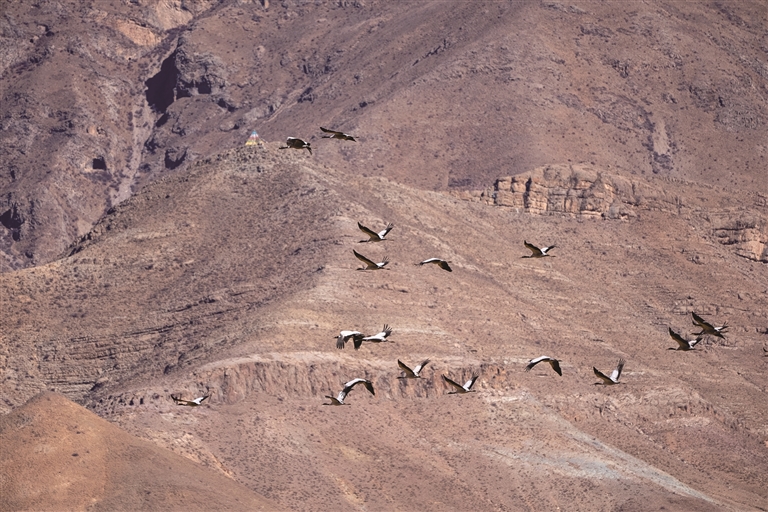 林周縣林業(yè)和草原局副局長尼瑪央宗介紹,卡孜水庫和虎頭山水庫周邊的96平方公里區(qū)域是鶴群最密集的棲息地,最大群落規(guī)??蛇_(dá)一千余只;卡孜鄉(xiāng)、強(qiáng)嘎鄉(xiāng)、春堆鄉(xiāng)、邊林鄉(xiāng)34.435平方公里未冬翻的青稞、小麥地,成為黑頸鶴的天然覓食區(qū),充足的食源為鶴群安穩(wěn)越冬提供了保障。如今,拉薩越冬黑頸鶴數(shù)量達(dá)4000余只,占全球總數(shù)的20%,獲評(píng)市鳥后,黑頸鶴更成為拉薩標(biāo)志性生態(tài)文化符號(hào),林周縣作為核心越冬地,見證著高原生態(tài)的持續(xù)改善。除黑頸鶴外,林周縣還擁有雪豹、白唇鹿等7種國家一級(jí)重點(diǎn)保護(hù)野生動(dòng)物,棕熊、猞猁等18種國家二級(jí)重點(diǎn)保護(hù)野生動(dòng)物,成為青藏高原重要的“物種基因庫”。