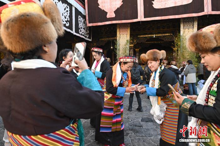 隨著藏歷十月十五白拉姆節(jié)(又稱“仙女節(jié)”)臨近,11月28日,西藏拉薩的婦女們?cè)诖笳阉绿陚鹘y(tǒng)舞蹈后自拍留念,迎接“仙女節(jié)”到來(lái)?!跋膳?jié)”即吉祥天母節(jié),藏語(yǔ)稱“白來(lái)日追”。相傳藏傳佛教最高護(hù)法神之一班丹拉姆的女兒白拉姆,不顧母親的反對(duì)與赤尊贊私定終身,班丹拉姆一怒之下將赤尊贊趕到拉薩河南岸,規(guī)定二人僅每年的藏歷十月十五日相見。中新社記者 貢嘎來(lái)松 攝