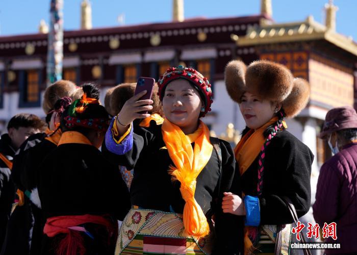 12月1日,西藏拉薩的婦女們盛裝來到拉薩大昭寺廣場,迎接“仙女節(jié)”到來?!跋膳?jié)”即吉祥天母節(jié),藏語稱“白來日追”。圖為拉薩婦女盛裝在大昭寺廣場拍照。中新社記者 李林 攝