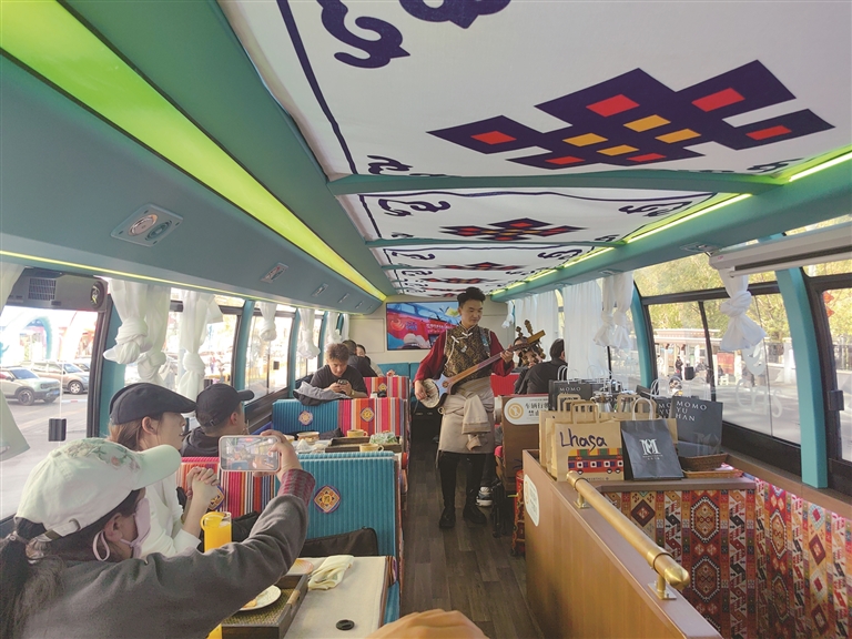 游客筱康從成都專程來到拉薩,通過網(wǎng)絡(luò)平臺(tái)了解到這輛觀光巴士后,毫不猶豫地購(gòu)買車票前來體驗(yàn)。坐上巴士,窗外的風(fēng)景如同一幅流動(dòng)的畫卷,隨著車輪的前行緩緩展開。八廓商城的熱鬧繁華、布達(dá)拉宮的雄偉壯觀、拉薩河的寧?kù)o秀麗、遠(yuǎn)處落日的余暉灑在大地上,川流不息的人群穿梭其中,側(cè)耳傾聽是城市的低語,煙火氣縈繞良久。而低頭品嘗著現(xiàn)做的美食,熱氣氤氳間,他深深感受到了這座城市的溫柔與魅力。筱康興奮地說:“我覺得這次體驗(yàn)感簡(jiǎn)直太棒了!觀光巴士沿著拉薩主城區(qū)的路線行駛,沿途可以看到大昭寺、布達(dá)拉宮、羅布林卡、拉薩河、南山公園等眾多美麗的風(fēng)景。更重要的是,車上還可以品嘗到現(xiàn)做的美食,喝著甜茶,欣賞著特色節(jié)目,還能親眼看到工作人員制作酥油茶、甜茶的過程,品嘗青稞爆米花,這種全新的體驗(yàn)真的非常值得推薦!”