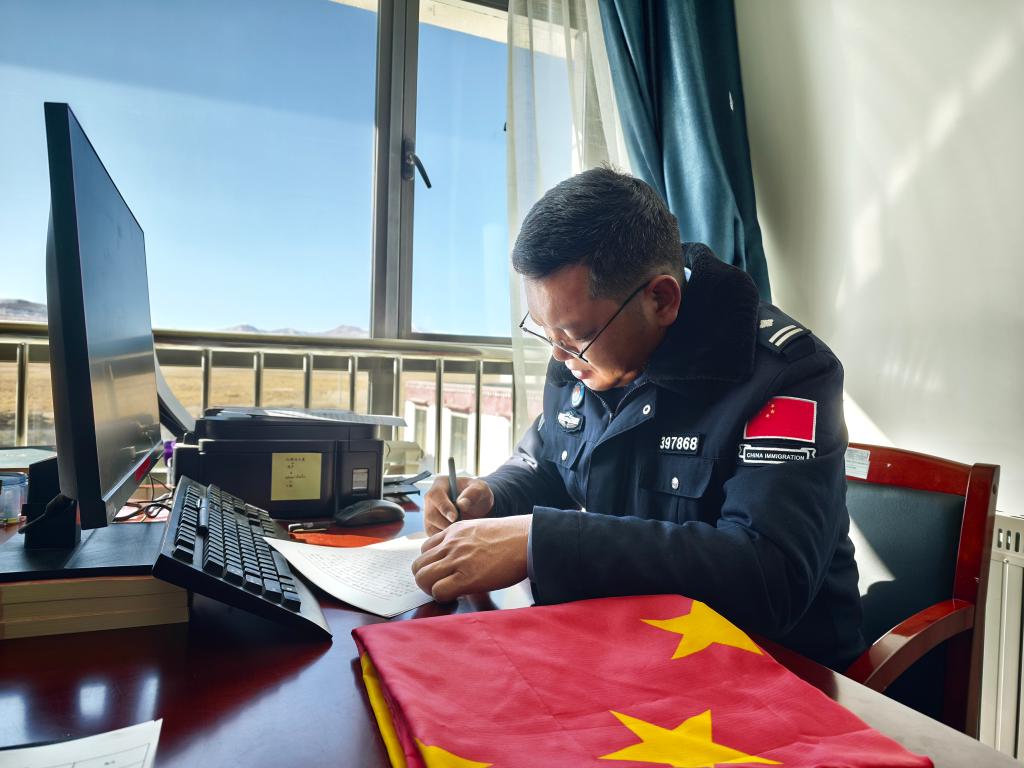 普瑪江塘邊境派出所所長普布扎西為海南大學(xué)愛心藝術(shù)團回信。(普瑪江塘邊境派出所供圖)