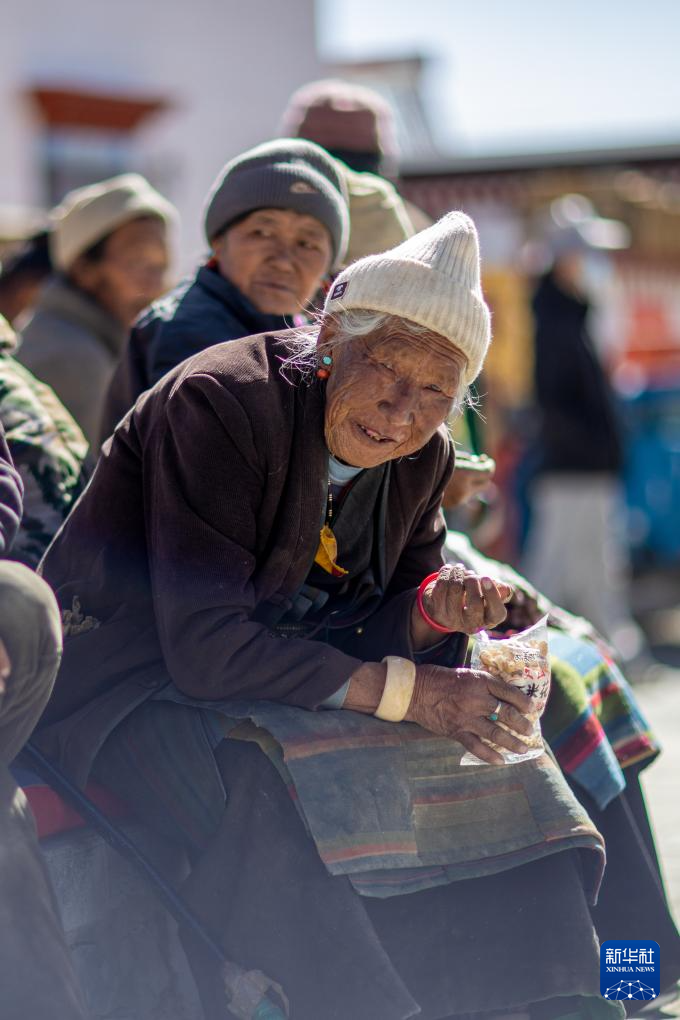 1月5日,在森嘎村村史館前的廣場上,老人曬著太陽吃著零食。新華社記者 姜帆 攝