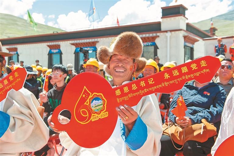 2025年8月15日,定日地震災后恢復重建首批民房入住儀式現(xiàn)場,群眾代表拿到新居“鑰匙”。西藏日報記者 旦增嘎瓦 攝