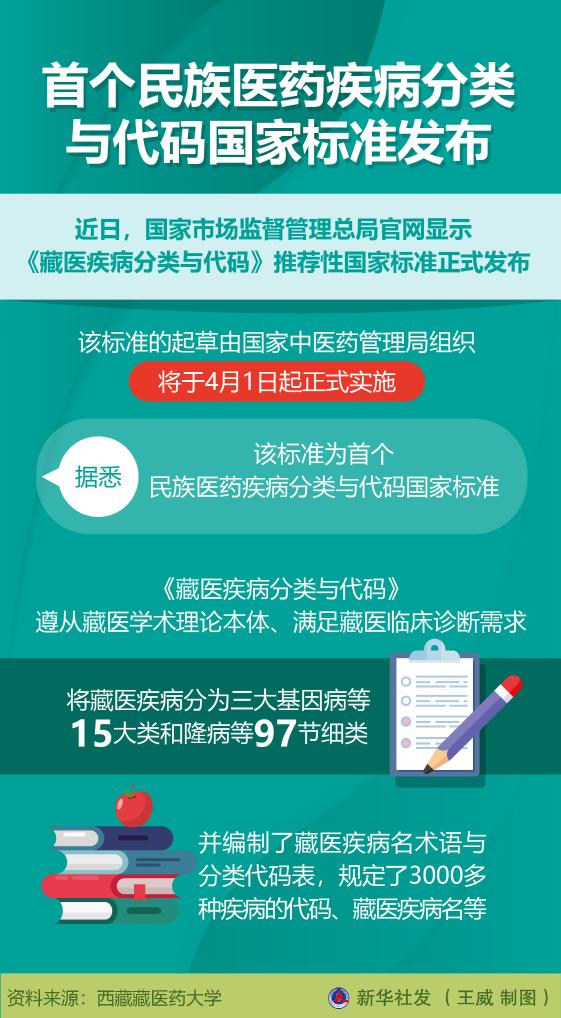 近日,國家市場監(jiān)督管理總局官網(wǎng)顯示《藏醫(yī)疾病分類與代碼》推薦性國家標(biāo)準(zhǔn)正式發(fā)布。記者從參與起草的西藏藏醫(yī)藥大學(xué)了解到,該標(biāo)準(zhǔn)的起草由國家中醫(yī)藥管理局組織,將于4月1日起正式實(shí)施。據(jù)悉,該標(biāo)準(zhǔn)為首個民族醫(yī)藥疾病分類與代碼國家標(biāo)準(zhǔn)。
