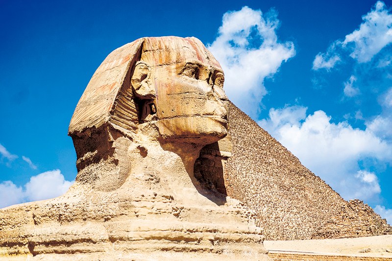 斯芬克司(獅身人面像)位于埃及哈夫拉金字塔附近,長約57米,高約20米,據(jù)說由一塊巨石雕成,象征法老威嚴(yán),是古埃及文明最有代表性的遺跡之一。圖為古埃及斯芬克司。