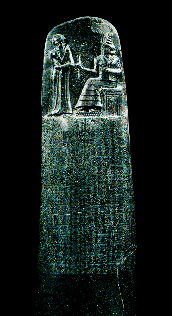 《漢穆拉比法典》是古代兩河流域文明的象征。這座在公元前18世紀(jì)建造的玄武巖石碑,上端有漢穆拉比從太陽神沙馬什手中接受權(quán)杖的浮雕像,下面用楔形文字銘刻法典全文。法典除序言和結(jié)語外,計有3500行、282條,包括訴訟手續(xù),財產(chǎn)權(quán),損害賠償,租佃關(guān)系,債權(quán)債務(wù),婚姻家庭,繼承以及買賣奴隸等內(nèi)容,是迄今世界上完整保存下來的最早的一部法典。圖為現(xiàn)藏于法國巴黎盧浮宮的《漢穆拉比法典》。