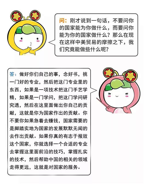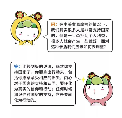 面對(duì)短期的困難和波動(dòng),青年人要清楚“美國在貿(mào)易戰(zhàn)中提出的要價(jià),不是小打小鬧”,應(yīng)該堅(jiān)定立場,“抗?fàn)幍降住?,也要“風(fēng)物長宜放眼量”,避免局限于眼前的小確幸,被暫時(shí)的挫折和困難所擊倒,要有與國家民族的發(fā)展同方向的扎實(shí)的行動(dòng),在實(shí)踐中實(shí)現(xiàn)自我價(jià)值。