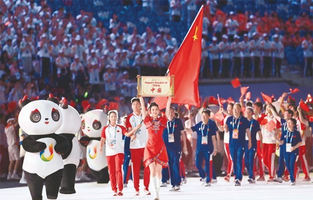 2023年7月28日,第31屆世界大學(xué)生夏季運(yùn)動(dòng)會(huì)開幕式在成都東安湖體育公園主體育場(chǎng)舉行。圖為中國(guó)大學(xué)生體育代表團(tuán)在開幕式上入場(chǎng)。 新華社記者 王曦/攝
