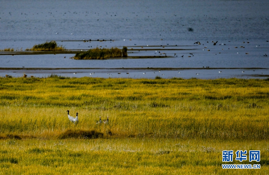 烏蘭縣都蘭湖國家濕地公園里,四只黑頸鶴挺立著。