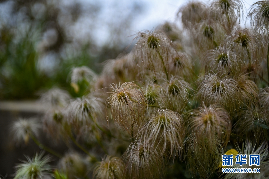 黃南藏族自治州同仁市的街道上,一簇甘青鐵線蓮在一場秋雨后掛上了玉珠。