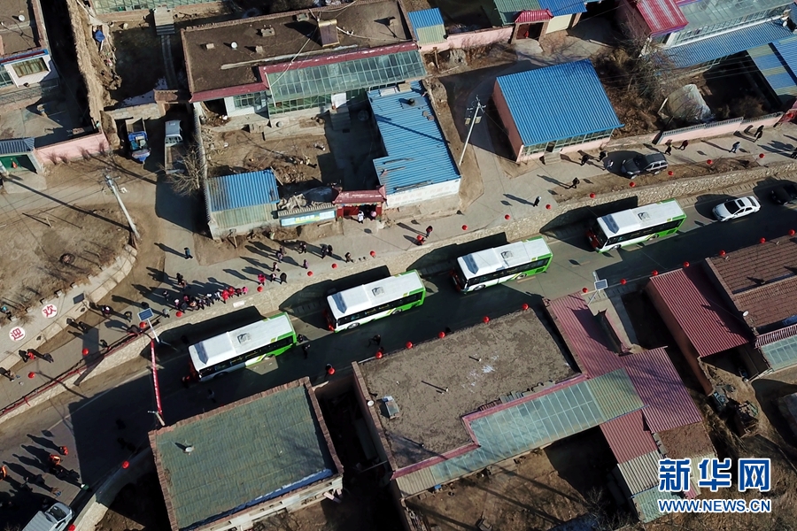 2018年1月16日,青海省首條交通扶貧公交專線在卡陽村開通運營,四輛嶄新的新能源公交車統(tǒng)一發(fā)車。新華網(wǎng) 潘彬彬攝