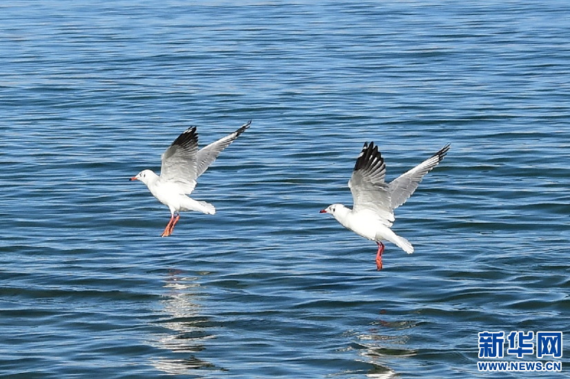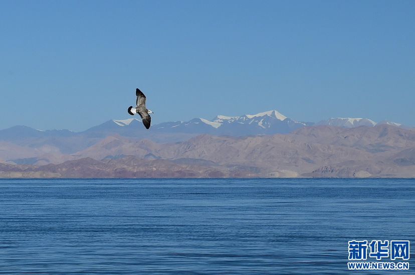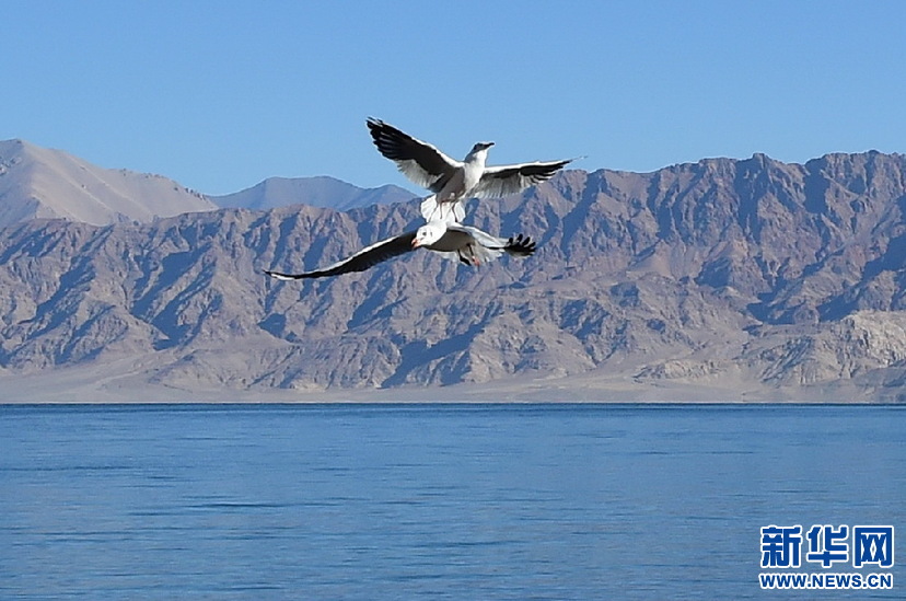 鳥(niǎo)兒在班公湖上空翱翔(10月19日攝)。新華網(wǎng) 張宸攝