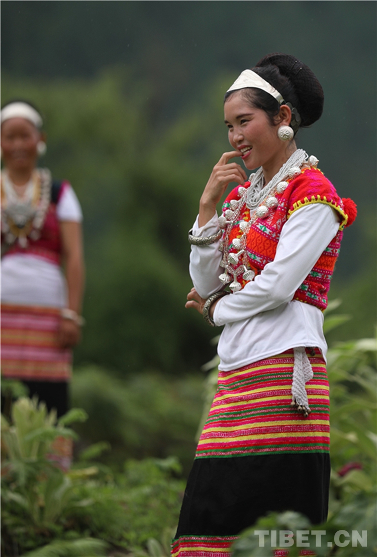 僜人婦女飾品極富特色,頭飾挽發(fā)髻盤于頭頂,發(fā)髻上插上雕花銀簪,銀簪垂數(shù)條細(xì)銀鏈,前額上方佩帶一種叫“格崩”的長(zhǎng)條橢圓形、形似柳葉狀的銀片,上雕有細(xì)密的太陽(yáng)、月亮圖案的花紋。胸前常佩戴三種形狀不同的飾物,一種叫“八紋得剛”,其形核桃般大小,形似燈籠狀,代表吉祥,一般20只左右穿在一起;一種叫“阿仍”,是多根細(xì)環(huán)繞在一起的直徑約40厘米的銀圈;另一種是將銀元鑿洞,串連在胸前。而且,僜人婦女普遍喜愛(ài)外型粗大、做工精巧的手鐲。