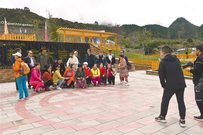 圖為來自四川的旅行團(tuán)在大峽谷景區(qū)門口合影。本報記者 張猛 胡文 攝