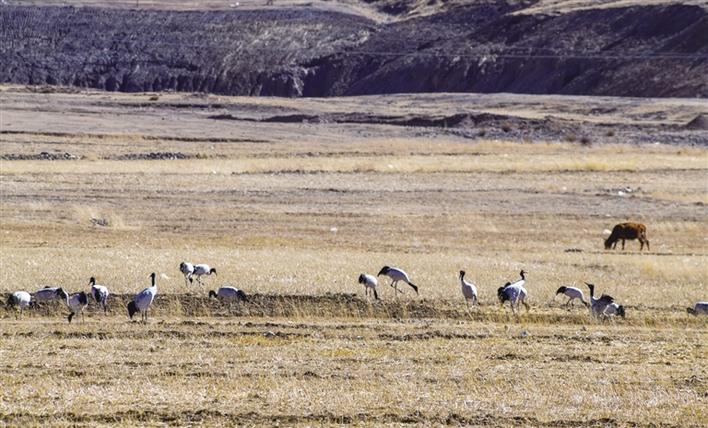 遠(yuǎn)遠(yuǎn)望去,只見(jiàn)高頸長(zhǎng)腿的黑頸鶴一邊覓食、一邊梳理羽毛,悠然自得。如果耐心一點(diǎn)在田間蹲守,不時(shí)還可以看到成群的黑頸鶴飛翔于冬日的藍(lán)天下,姿態(tài)優(yōu)美地盤(pán)旋,尋找合適的田間落下。旦增說(shuō),它們要覓食至傍晚時(shí)分,才成群結(jié)隊(duì)飛回虎頭山水庫(kù)。