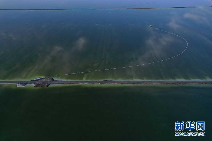 一艘工作船行駛在察爾汗鹽湖內(nèi)(11月27日攝)。新華社記者 張龍 攝