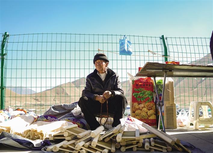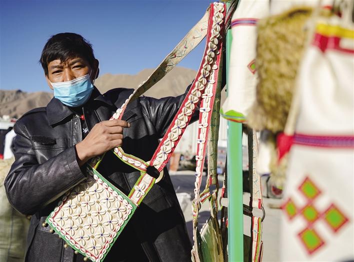 “這個小包好精致,太好看了?!钡┰龅臄偳皣@著一群人?!澳莻€最小號的包還有嗎?”“不好意思,都賣完了,您看看其他型號的吧。”來自林芝市朗縣的旦增已經(jīng)是第四次參加物資交流會了,此次物資交流會他不僅帶來了核桃、辣椒、蘋果等當(dāng)?shù)靥厣a(chǎn)品,還帶來了牦牛皮制作的手工包。
