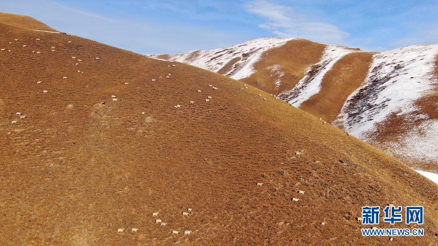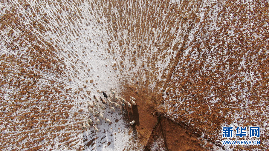 12月6日,羊群在雪后的阿柔草原上活動(dòng)(無(wú)人機(jī)照片)。新華社記者 張宏祥 攝