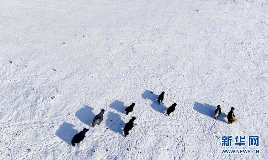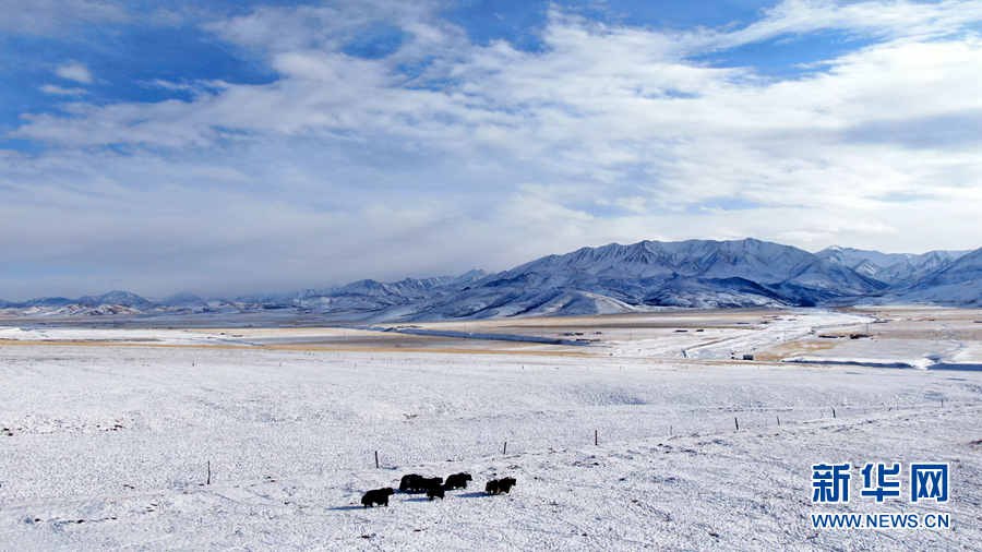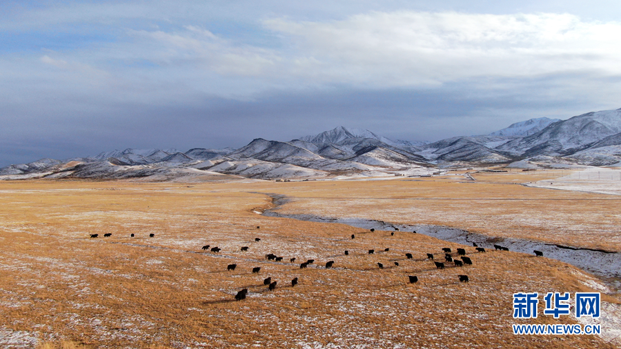 12月6日,牦牛在雪后的阿柔草原上活動(dòng)(無(wú)人機(jī)照片)。新華社記者 張宏祥 攝