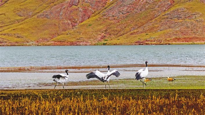 在冬日暖陽的照耀下,成群結(jié)隊的鳥兒在河面上、濕地里盡情嬉戲,赤麻鴨悠然戲水、斑頭雁低聲吟唱、黑頸鶴翩翩起舞……一派熱鬧的景象。