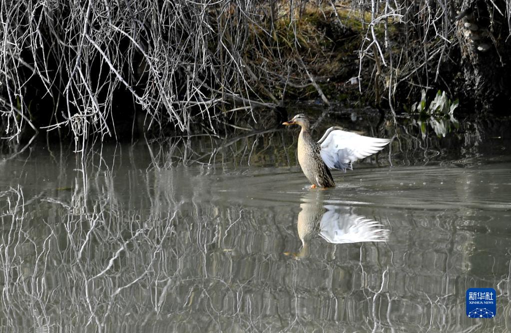野鴨在拉魯濕地舒展翅膀(3月30日攝)。新華社記者 張汝鋒 攝